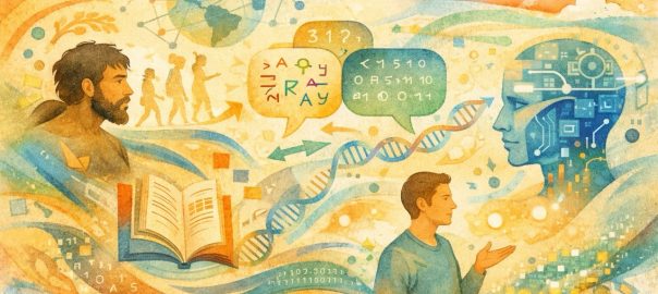 When we look back at human history—not just recent history, but the million years of early human development—something shifts dramatically around 70,000 to 100,000 years ago. As Yuval Noah Harari describes in Sapiens, the evolutionary development before that point was, in relative terms, glacially slow. Humans looked much like other primates, with similar cognitive constraints and limitations. Then something changed: language—or rather, language as a complex system of symbolic communication—arrived, and with it, the ability to think in long sequences of meaningful symbolic units.